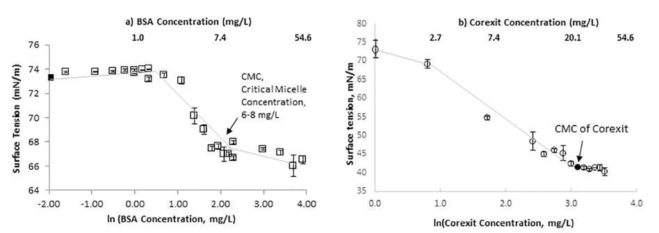 圖 4.a) 顯示了海水中模型蛋白質的 SFT 作為其濃度自然對數的函數。 BSA 蛋白的 CMC 為 6–8 mg/L。 b) 顯示 Corexit 的 CMC 濃度為 22 mg/L。