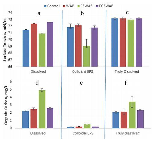 圖 2 中的有機碳表明大部分溶解的 部分,圖 2d,由低分子量碳組成,因為總溶解部分,圖 2f,幾乎等于 有機碳濃度中的溶解分數。 膠體 餾分(圖 2e)表明超濾已去除了 85% 到 95% 的 溶解部分的有機碳。 這可能表明 5% 到 15% 的 CEWAF 可能保留在 EPS 膠體部分中, 表明 SFT 的降低(圖 2b)也受 Corexit 的影響 和 WAF。 然而,使用 SFT 與 Corexit 濃度數據, 圖 4b,即使是 15% 的 Corexit 也無法解釋 在圖 1 的 CEWAF 處理中測量的 SFT 降低。