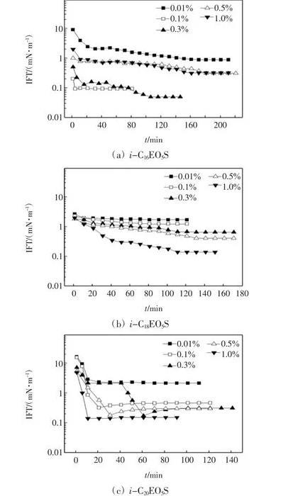 (1)本文研究的3種支鏈化脂肪醇聚氧乙烯醚磺酸鹽具有一定的降低界面張力活性,界面張力可達10-2mN/m數量級。