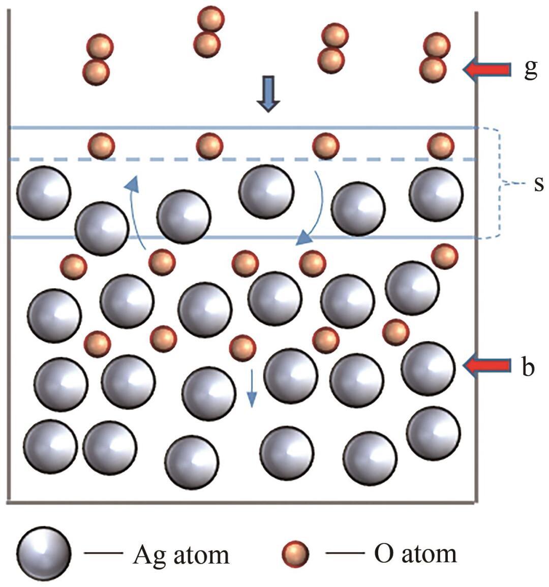 根據圖1,首先O2分子從氣相(g)擴散至表面相(s);其次在Ag的催化下解離為O原子,并發(fā)生化學吸附;最后,O原子從表面相(s)擴散至本體相(b)。整個過程可以表示為:
