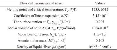 式(7)表示在整個溫度范圍內,液態(tài)Ag的表面張力與溫度的關系,相關參數的取值列于表1[21-26]。