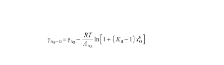 由式(12)和(13)可以看出,Butler方程計算較為復雜。考慮液態(tài)氧的表面張力很小[14],可以認為γO≈0。另外,由于Ag-O系中O原子數遠小于Ag原子數[29],可以將Ag-O溶體視為理想溶體。此時,GE,b=G=G=0。根據文獻[18],當式(12)所示的Butler方程用于描述理想溶液時,通過假設系統內兩組分具有相等的摩爾表面積,可以得到改進的Butler方程。這個改進的Bulter方程能夠推導出Gibbs吸附方程和Langmuir方程,被認為是表面張力和溶液吸附的根本方程。因此,令AAg=AO,將式(12)變換為: