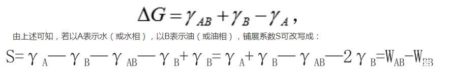 此外黏附功的計算式中γAB為A和B的液液界面張力,關于這個界面張力的計算,有多重理論,最簡單的一種是Antonoff規則,該規則認為γAB=γA飽和—γB飽和,式子中γA飽和、γB飽和指的是指的是液體A和液體B相互飽和后的表面張力,而不是其各自的表面張力。