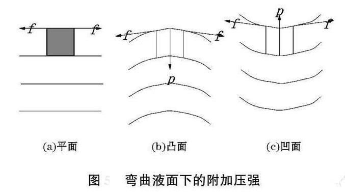 如果熔體表面是凸面,如圖3b所示,因表面張力沿周界與熔體面相切,則沿周界各個方向的表面張力f將產生一個指向熔體內部的合力p(正壓力),使得熔體表面曲率變小。如果液面是凹面,如圖3c所示,表面張力的合力將指向熔體外部,對熔體則產生一個負壓力,使得凹面變平,甚至有可能轉化為凸面。由于表面張力的作用,熔體表面能夠截凸補凹,自動修復,表面平滑,這正是陶瓷釉層表面能夠平整光滑的主要原因。