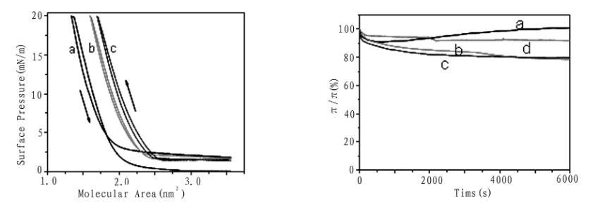 圖3化合物1的壓縮/擴張循環等溫線(左圖,a,b,c分別為1,2,3次)和不同亞相上的膜穩曲線(右圖,a純水,b乙二酸,c丙二酸,d丁二酸)