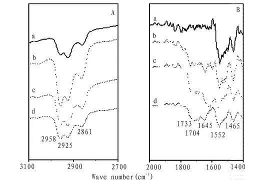 圖5化合物1在不同亞相時轉移30層膜的FT-IR圖譜