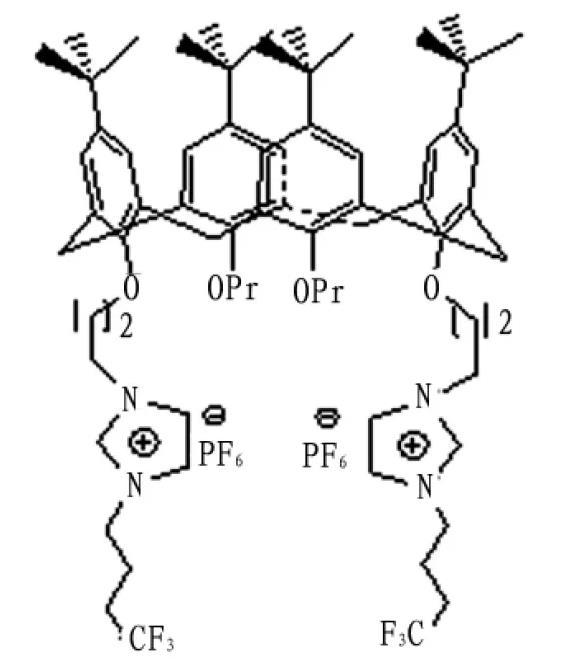 含氟杯芳烴離子鹽化合物1按參考文獻方法合成,其它所用試劑均為分析純,從國藥集團化學試劑有限公司購買,鍍膜用氯仿重蒸后使用,實驗用水為二次石英亞沸蒸餾水。π-A等溫曲線測量和LB膜制備在KSV-5000儀器上(芬蘭)進行,紫外光譜用U-3010紫外可見分光光度計(日本Hitachi公司)測定,紅外光譜用Niconet 5700光譜儀測定,檢測分辨率為4 cm-1,掃描32次消除基底噪音的影響。