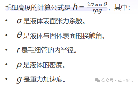 解答上述問題,可以從毛細(xì)高度的計算公式中找到答案。