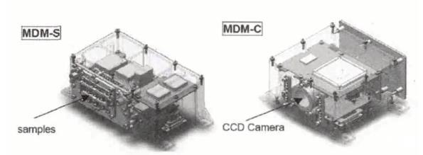日本計(jì)劃在SLATS衛(wèi)星上搭載環(huán)境效應(yīng)探測(cè)器,進(jìn)行空間環(huán)境的監(jiān)測(cè)及材料暴露試驗(yàn),這是首次在50 km軌道上開(kāi)展材料暴露試驗(yàn)。該暴露試驗(yàn)通過(guò)兩個(gè)搭載模塊實(shí)施,分別為MDM-S和MDM-C(MDM為MateriasDegradation Monitor的縮寫(xiě)),其中MDM-S是一個(gè)包含9種材料被動(dòng)暴露試驗(yàn)的樣品盒,而MDM-C是CCD,用于對(duì)暴露試驗(yàn)中樣品的退化情況進(jìn)行拍照。