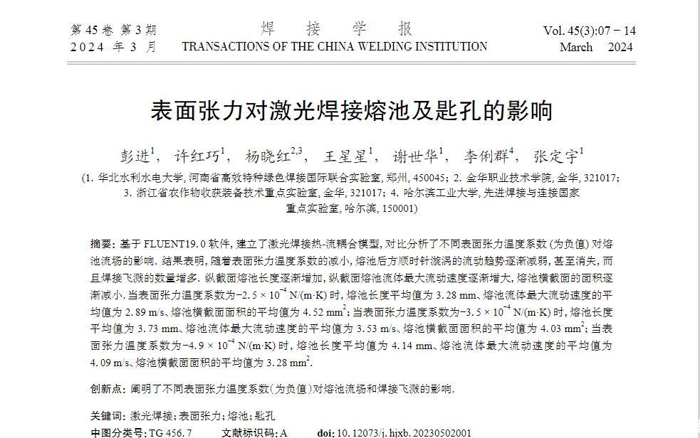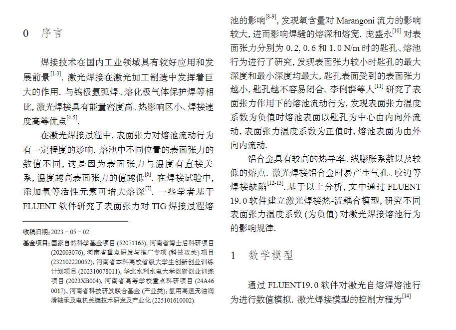 基于FLUENT19.0軟件,建立了激光焊接熱-流耦合模型,對比分析了不同表面張力溫度系數(為負值)對熔池流場的影響。