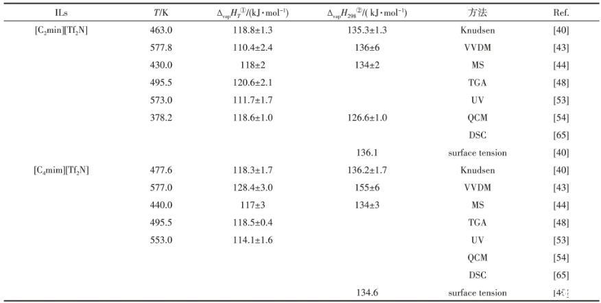 表1用不同實驗方法測定的離子液體[Cnmim][Tf2N](n=2,4)的汽化焓