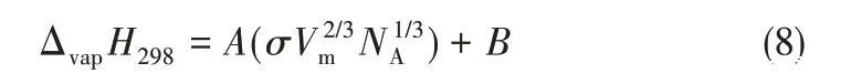 2006年,Kabo等[40]總結了摩爾體積、表面張力和摩爾汽化焓的關系,得出汽化焓的相關方程