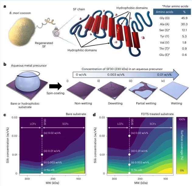 圖1作為天然表面活性劑的SF。b,旋轉(zhuǎn)涂層金屬水合物提高表面覆蓋率的示意圖。金屬水合物溶液的表面覆蓋率的示意圖。c,d,添加了SF的金屬水溶液的表面覆蓋率(%)。的表面覆蓋率(%)。基底(c)和基底上的表面覆蓋率(%)。基底(d)上SF添加的金屬水溶液的表面覆蓋率(%)與濃度和分子量的函數(shù)關(guān)系。