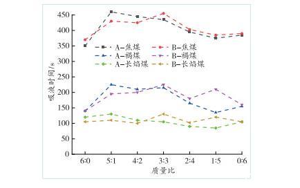 圖6為A、B組復配溶液與3種煤樣接觸角的對比圖,不同煤樣吸液時間變化情況如圖7所示。
