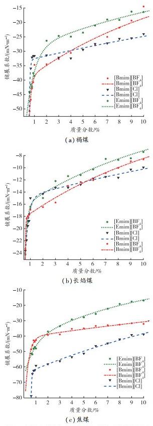 2)3種咪唑類離子液體的鋪展系數隨離子液體質量分數的增大而迅速增大,長焰煤的親水能力最好,而焦煤的親水能力最差,這與煤中親水基團和疏水基團的含量有關;
