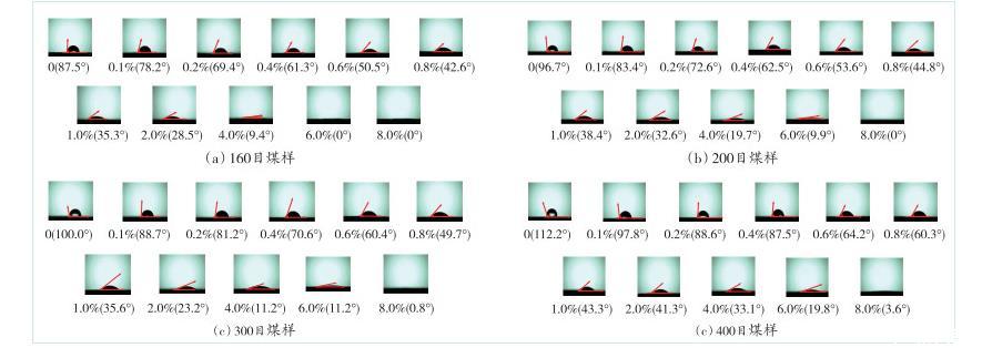 接觸角是指在氣、液、固三相交界處的氣—液界面和固—液界面之間的夾角。接觸角作為測試液體對固體潤濕效果的重要參數,對測試煤塵的潤濕性具有重要作用,接觸角越小,液體對固體的潤濕效果越強。利用接觸角測量儀,對液滴與測試煤樣之間的接觸角進行成像,如圖4所示(圖像從左到右,溶液中EMI質量分數逐漸增大)。由圖4可知,隨著煤樣粒徑的減小,4種煤樣與液滴之間的接觸角均逐漸增大。當加入EMI溶液后,4種煤樣的接觸角隨溶液中EMI質量分數增大而變化的趨勢大致相同,均呈現出逐漸減小的趨勢,表面疏水性減弱,煤塵潤濕性增強。