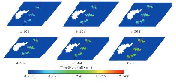 模擬悶井時間分別為10、20、30、40、50、60d,研究CO2吞吐過程中的界面張力變化,結(jié)果如圖1所示。由圖1可知:悶井過程中,CO2擴(kuò)散并與原油充分接觸,界面張力較低?隨著CO2持續(xù)擴(kuò)散,界面張力有所增加。在不同悶井時間下,裂縫中致密油平均界面張力分別為0