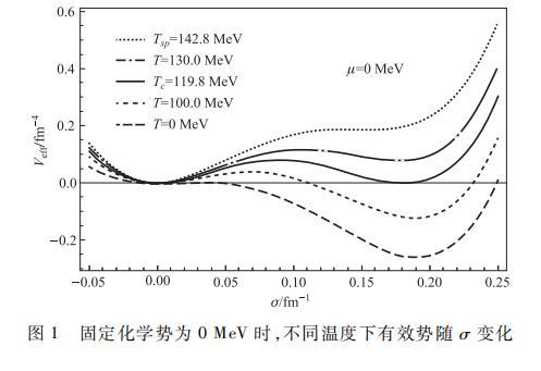 為了更加準(zhǔn)確地描述夸克-膠子等離子體(Quark-Gluon plasma,QGP)與強(qiáng)子物質(zhì)之間的相變特征,在溫度密度有限的情況下,通過嚴(yán)格的數(shù)值方法,固定化學(xué)勢(shì)為μ=0 MeV,作出如下有效勢(shì)Veff隨σ場(chǎng)變化的函數(shù)關(guān)系圖像。其中,由上至下曲線的溫度依次設(shè)定為T=142.8,130.0,119.8,100.0以及0 MeV.如圖所示,在溫度相對(duì)較低時(shí),每條勢(shì)能曲線都具有兩個(gè)極小值和一個(gè)極大值,一個(gè)極小值位于σ較小的σ0處,另一個(gè)極小值位于σ較大的σv處,其間存在一個(gè)局域極大值,對(duì)應(yīng)兩極小值之間存在的勢(shì)壘。