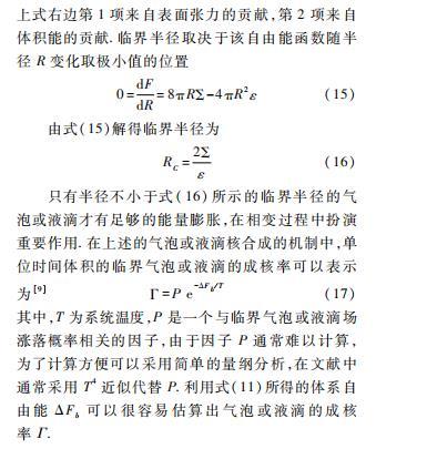 時(shí)~R3的效應(yīng)更明顯。對(duì)于由漲落產(chǎn)生的半徑小于某一特定半徑Rc的氣泡或液滴,表面張力的效應(yīng)強(qiáng)于體積能效應(yīng),其將在表面張力作用下不斷收縮直到消失;但對(duì)于半徑大于Rc的氣泡或液滴,體積能效應(yīng)強(qiáng)于表面張力的效應(yīng),此時(shí)氣泡或液滴將不斷膨脹直至充斥整個(gè)空間,原本的偽真空背景將被真真空所取代,完成了相變過程。上述特殊的半徑Rc稱為臨界半徑。在我們所研究的體系中,我們主要考慮熱漲落效應(yīng)而忽略量子漲落效應(yīng)。