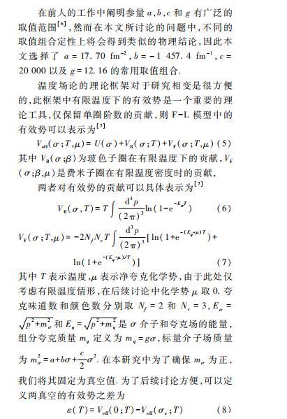 由于氣泡或液滴只有在一級(jí)相變過程中才會(huì)出現(xiàn),而F-L模型將復(fù)雜的膠子場(chǎng)簡(jiǎn)化為易處理的標(biāo)量場(chǎng)進(jìn)行唯象地描述,能夠抓住夸克物質(zhì)一級(jí)相變中氣泡或液滴動(dòng)力學(xué)中的關(guān)鍵物理性質(zhì),同時(shí)帶來非線性動(dòng)力學(xué)場(chǎng)方程求解上的極大簡(jiǎn)化,因此本文采用F-L模型。雖然在研究QCD的有效模型中還有各種手征模型,但是考慮到其具有同位旋內(nèi)稟自由度,對(duì)應(yīng)氣泡或液滴的動(dòng)力學(xué)場(chǎng)方程將變得更為復(fù)雜,我們將在未來的工作中進(jìn)一步考慮這些問題。