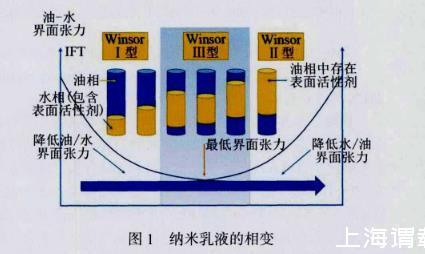 一般來說,納米乳液分為3種類型,即油包水型納米乳液(簡稱W/O)、水包油型納米乳液(簡稱O/W)和雙連續型納米乳液。Winsor根據油相或水相是否連續對納米乳液進行分類,如圖1所示,即WinsorⅠ型是油包水型納米乳液,表面活性劑存在于水相中;WinsorⅡ型是水包油型納米乳液,表面活性劑存在于油相中;WinsorⅢ型是通過表面活性劑吸附界面膜作用形成的雙連續相體系,油相水相相對平衡,同時WinsorⅢ型納米乳液在高濃度表面活性劑作用下不能完全溶解油水,因此產生了WinsorⅣ型單相納米乳液,該體系中油相和水相總量大致相同;其中WinsorⅣ型和WinsorⅢ型均是超低界面張力的納米乳液。