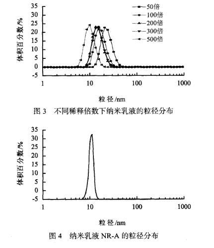 利用英國馬爾文2000激光粒度儀采用濕法進行微乳液粒徑測量。圖3為微乳液在不同稀釋倍數下得到納米乳液的粒徑分布。從圖3可知,微乳液稀釋50倍時得到的納米乳液粒徑D50為10~50 nm;微乳液稀釋500倍時納米乳液粒徑D50為5~20 nm;微乳液粒徑隨稀釋倍數的增加而減小,符合乳液的粒徑分布規律。納米乳液NR-A由微乳液稀釋500倍后制得,其粒徑分布結果見圖4,從圖4可知,納米乳液NR-A的粒徑分布較窄,90%膠團粒徑在11 nm以下。