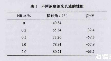 研究測試納米乳液NR-A在致密砂巖巖心表面的接觸角和Zeta電位,評價其在致密砂巖巖心表面的潤濕情況和穩定性,為含油廢物的脫附剝離提供判斷依據,測試結果如表1所示。
