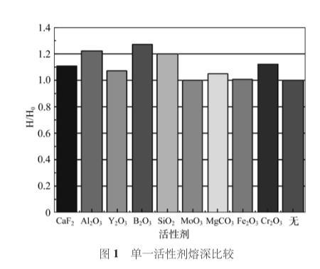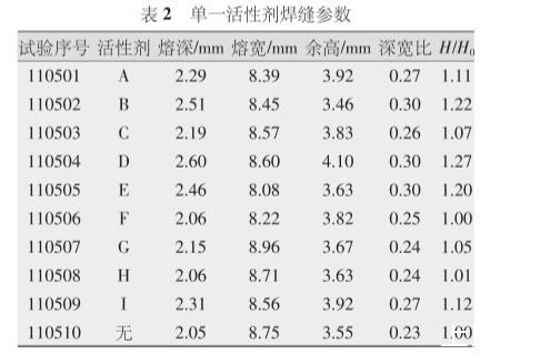 單一活性劑焊縫參數及無活性劑時焊縫參數如表2所示,表2單一活性劑焊縫參數,圖1是單一活性劑熔深與無活性劑時熔深比直方圖。