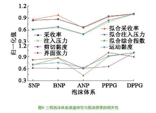 圖8三相泡沫體系溶液特性與驅油效果的相關性