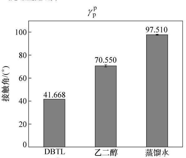 調(diào)和平均法計(jì)算CBT500與DBTL界面張力(12),CBT500、DBTL表面張力()、極性分量(p)、色散分量(d)研究是基礎(chǔ)。CBT500色散分量、極性分量通過(guò)引入2種測(cè)試液體求解二元二次方程組,DBTL色散分量、極性分量通過(guò)研究DBTL在PP薄板上靜態(tài)接觸角并結(jié)合表面張力是材料極性分量、色散分量之和進(jìn)行二元二次方程組求解。