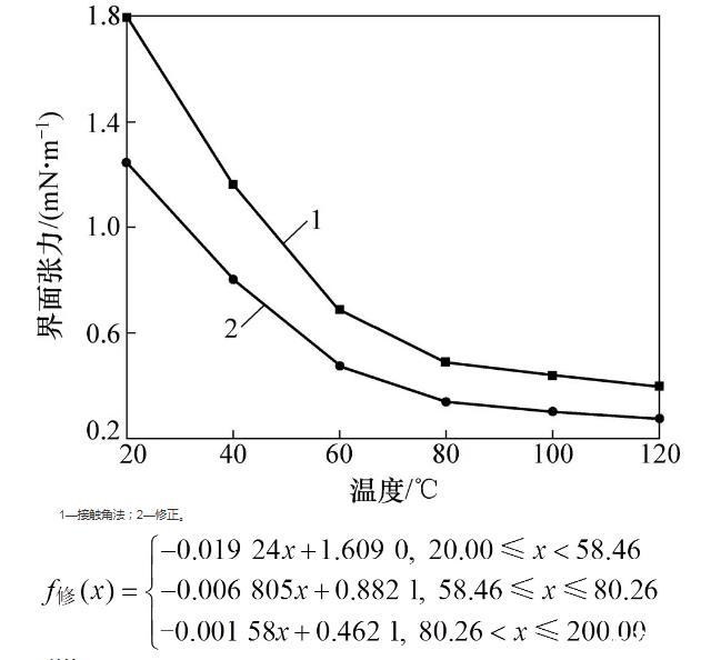 3)20℃下,采用調(diào)和平均法計(jì)算DBTL與CBT500界面張力為1.243 4 mN/m,接觸角法計(jì)算值為1.799 7 mN/m,調(diào)和平均法計(jì)算值相比接觸角法計(jì)算值約小44.74%,結(jié)果比=20≈1.447 4;依據(jù)相似理論,在20,40,60,80,100和120℃溫度下,修正后接觸角法計(jì)算得到的DBTL與CBT500界面張力比修正前整體小44.7%,更加接近真實(shí)值。