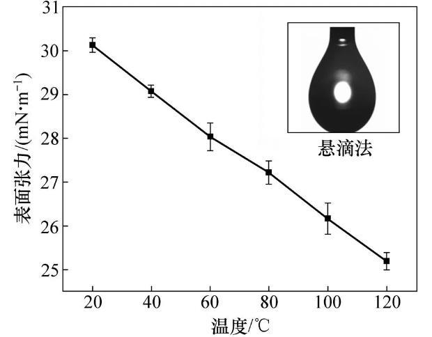 采用瑞典Biolin Scientific Theta光學(xué)接觸角測(cè)量?jī)x的懸滴法測(cè)量20,40,60,80,100和120℃溫度下DBTL的表面張力。將DBTL緩慢從自制滴管中滴出,當(dāng)液滴外形出現(xiàn)輕微縮頸時(shí),保溫30 s,測(cè)量該狀態(tài)下表面張力,每個(gè)溫度點(diǎn)測(cè)5次求算術(shù)平均值作為該溫度下表面張力。