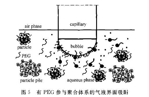 由圖3可見,有PEG參與的聚合體系。5rain的DST與圖2相比變化起伏較大,有先低后急升再緩降的變化模式,與一般的DST呈單調(diào)減小的趨勢有很大不同。這是因為在反應(yīng)剛開始體系中除了單體、齊聚物和膠粒,又增加了PEG,而且PEG與齊聚物、膠粒作用形成粒子堆口]。PEG是完全水溶性物質(zhì),在體系水相中的濃度遠(yuǎn)遠(yuǎn)大于單體和齊聚物,但擴散速率要小于單體及齊聚物,因此一開始部分新形成的氣液界面會由擴散速率最快的單體迅速占領(lǐng),而隨時間推移PEG借助濃度優(yōu)勢會替代單體占據(jù)氣液界面,如圖5所示,最終達(dá)到平衡,由單體、齊聚物和PEG共同覆蓋整個氣液界面。PEG水溶液的氣液界面張力要比單體的氣液界面張力大得多,因此在水相中有大量單體存在的情況下,此聚合體系的DST會出現(xiàn)先低后急升的曲線形狀。這個狀況會一直持續(xù)到30rain時,可以看出,PEG使體系直到30min時仍有大量游離單體存在于水相,而無PEG參與的體系此時已無單體游離在水相中。這一點可以從圖6轉(zhuǎn)化率一時間曲線得到證實,無PEG參與的體系30min時已接近聚合終點,而有PEG參與的體系轉(zhuǎn)化率才只有25左右。待反應(yīng)至50min時,DST趨勢平穩(wěn),水相中游離的單體已經(jīng)很少,此時轉(zhuǎn)化率在49左右,說明單體已基本進(jìn)入到膠粒中。這個狀態(tài)一直維持到60min時。75min時的體系有很大變化,從宏觀看粒徑發(fā)生轉(zhuǎn)變,由大變小。從DST曲線看氣液界面張力明顯提高,轉(zhuǎn)化率已快速增加到95,接近終點。此時體系中對DST的貢獻(xiàn)主要以脫離粒子堆的成熟粒子l3和PEG為主。