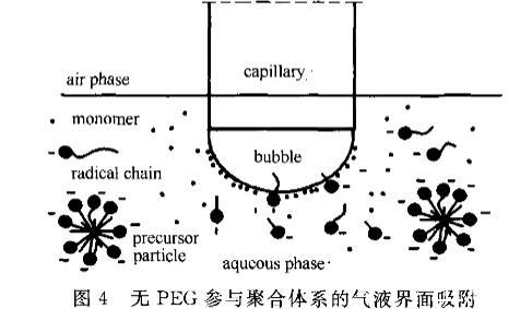 由圖2可見,無PEG參與的聚合體系中,隨聚合進(jìn)行,體系所表現(xiàn)的氣液界面張力趨勢為逐漸增大,從5min的28mN·m~左右到6Omin的60~65ITIN·m~,75min則稍有回落,在55~61mN·m。各時間段的DST趨勢較為平穩(wěn)。這種氣液界面張力隨聚合進(jìn)行逐漸上升的趨勢較為符合無皂乳液聚合反應(yīng)機理。在反應(yīng)初期水相中不僅有溶解在水中的單體,還有引發(fā)形成的齊聚物,這種齊聚物一端帶有疏水鏈段,另一端帶有親水性的一SO引發(fā)劑碎片,具有表面活性。當(dāng)齊聚物達(dá)到膠束濃度時會聚并成基本粒子,由幾十個到上百個齊聚物組成。溶解在水相中的單體分子量相對齊聚物小很多,體積小,擴散速率快,極易遷移至氣液界面。對于一開始的反應(yīng),體系中仍有大量單體存在,水相中的單體濃度基本保持在飽和狀態(tài),因此大部分氣液界面首先由單體等物質(zhì)占據(jù),還有極少部分的界面由具有表面活性的齊聚物覆蓋,如圖4所示。所以與圖1對比會發(fā)現(xiàn),5min時的氣液界面張力非常接近單體本身的氣液界面張力。隨聚合進(jìn)行,水相中的單體逐漸耗光,氣液界面張力開始逐漸上升,此時到達(dá)氣液界面的則主要是齊聚物和膠粒,相對單體的遷移速率要慢很多,因此10min以后的DST衰減斜率要大于5rain時的。