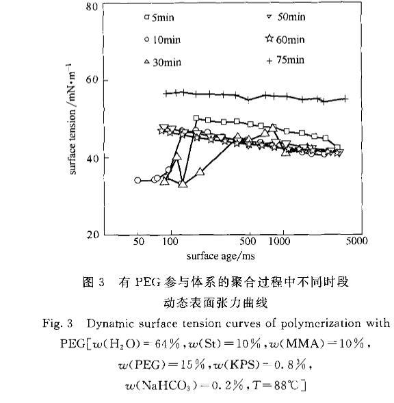 由于PEG的存在,使St/MMA在水相中經(jīng)歷了不一樣的聚合過程,PEG會使體系的反應(yīng)速率變慢,當(dāng)反應(yīng)到50min時轉(zhuǎn)化率只有49,而無PEG參與的體系在30min時聚合已接近終點,轉(zhuǎn)化率達(dá)到98以上。St/MMA和引發(fā)劑形成的聚合物在PEG的作用下,形成了一種具有更強表面活性的聚合物,其表面活性水平高于PEG以及無PEG參與的聚合體系的聚合物,但弱于混合單體及齊聚物。這種較強表面活性的聚合物在轉(zhuǎn)化率只有5的時候就已經(jīng)存在,是聚合物進(jìn)入粒子堆形成小粒子且穩(wěn)定粒子的動力,并最終使粒子帶有足夠脫離粒子堆的表面電荷。