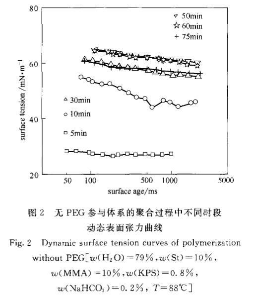 2.2聚合時間對動態(tài)表面張力變化趨勢的影響經(jīng)引發(fā),水相中溶解的單體聚合成鏈,聚合體系的組分也隨之發(fā)生變化。體系在水相中含有了自由基齊聚物,以及由齊聚物聚集形成的基本粒子或膠束。這些新產(chǎn)生的物質(zhì)對DST曲線有很明顯的影響,加上PEG與聚合物鏈的相互作用,則使DST曲線有更多的變化。為了能明確地分析PEG在聚合過程中的作用,進(jìn)行了有PEG和無PEG參與的聚合體系各時間段動態(tài)表面張力實驗比較。圖2和圖3分別為St/MMA在無PEG的水中和有PEG的水溶液中DST隨聚合時間的變化趨勢。