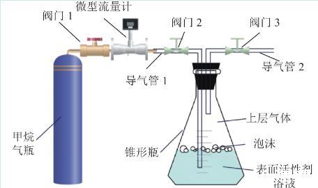 采取自主研發(fā)的泡沫對氣體緩釋效應(yīng)試驗裝置進(jìn)行試驗,試驗裝置如圖2所示。將250 mL表面活性劑溶液置于密閉錐形瓶,使用微型流量計控制甲烷氣體勻速向表面活性劑溶液中以300 mL/min速度通入50 mL氣體。試驗具體步驟如下: