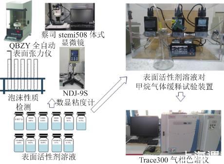 試驗流程如圖1所示。將兩種表面活性劑配置質(zhì)量分?jǐn)?shù)為0.01%、0.02%、0.05%、0.1%、0.15%的溶液,使用QBZY全自動表面張力儀對不同質(zhì)量分?jǐn)?shù)表面活性劑溶液以及去離子水進(jìn)行表面張力測量,NDJ-9S數(shù)顯粘度計測表面活性劑溶液黏度,注氣法檢測溶液泡沫性質(zhì),蔡司stemi508體式顯微鏡觀察泡沫形態(tài)。上述基礎(chǔ)參數(shù)測定結(jié)束后,使用自行研制的表面活性劑溶液對甲烷緩釋試驗裝置進(jìn)行泡沫對甲烷緩釋效應(yīng)影響試驗,并采用Trace300氣相色譜儀定量檢測分析。