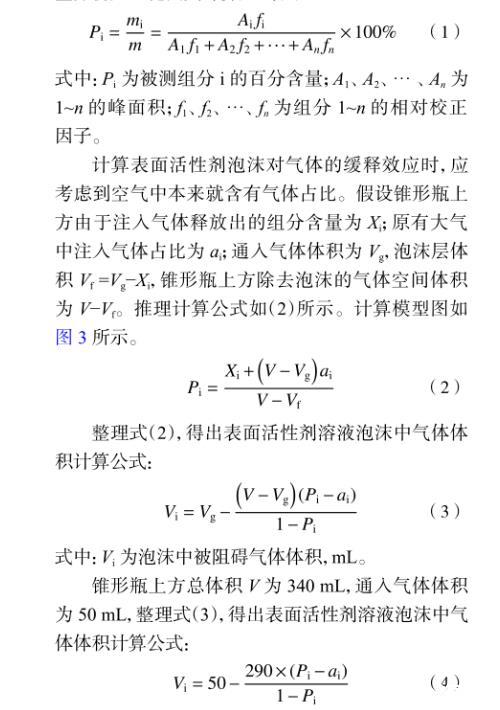 計算表面活性劑泡沫對氣體的緩釋效應(yīng)時,應(yīng)考慮到空氣中本來就含有氣體占比。假設(shè)錐形瓶上方由于注入氣體釋放出的組分含量為Xi;原有大氣中注入氣體占比為ai;通入氣體體積為Vg,泡沫層體積Vf=Vg?Xi,錐形瓶上方除去泡沫的氣體空間體積為V?Vf。推理計算公式如(2)所示。計算模型圖如圖3所示。