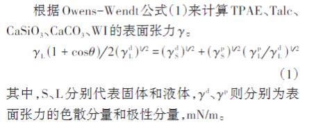 根據Owens-Wendt公式(1)來計算TPAE、Talc、CaSiO3、CaCO3、WI的表面張力γ。