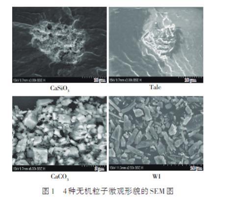 4種無機粒子的表觀形貌如圖1所示,可以看出,CaSiO3顆粒為多孔蜂窩狀結構,Talc顆粒形狀為偏平形,CaCO3顆粒形狀不規則,WI多為針狀形顆粒。