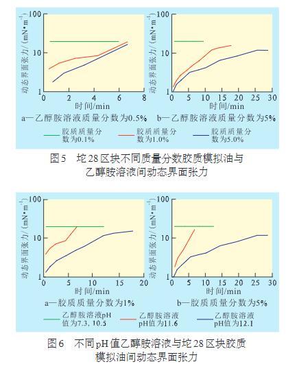 ZhangL等曾對(duì)勝利油區(qū)孤東油田外輸油中的酸性組分按相對(duì)分子質(zhì)量和極性細(xì)分,研究發(fā)現(xiàn):對(duì)于相對(duì)分子質(zhì)量較低的脂肪酸,弱堿條件下就能夠發(fā)生反應(yīng),大幅度降低界面張力瞬時(shí)值,但穩(wěn)態(tài)值較高,動(dòng)態(tài)界面張力曲線呈“V”型,油酸模擬油的動(dòng)態(tài)界面張力特性就是典型代表;而對(duì)于相對(duì)分子質(zhì)量較高、含稠環(huán)的芳香酸,則只能與強(qiáng)堿發(fā)生反應(yīng),生成的芳香酸皂水溶性較弱,傾向于吸附在界面上,因此,動(dòng)態(tài)界面張力不再出現(xiàn)極小值。坨28區(qū)塊原油的酸性組分是混合酸,其中不同結(jié)構(gòu)的石油酸可能在不同pH值條件下分別起主導(dǎo)作用:低質(zhì)量分?jǐn)?shù)的乙醇胺溶液主要與低相對(duì)分子質(zhì)量的脂肪酸作用,而高質(zhì)量分?jǐn)?shù)的乙醇胺溶液主要與高相對(duì)分子質(zhì)量的芳香酸作用。