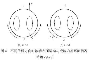 傳質方向對分散相滯存率的影響是由于Marangoni效應影響液滴破碎和聚并引起的。圖2和圖3中傳質方向為d→c的分散相滯存率遠高于傳質方向c→d的,原因在于本實驗所用的正丁醇-丁二酸-水體系是界面張力隨濃度增加而減小的體系(即?γ/?c<0)。在?γ/?c<0體系的d→c傳質過程中[如圖4(a)所示],界面張力梯度導致液滴表面的運動方向與液滴內部環流方向相同,有利于液滴的破碎。而c→d的傳質過程[如圖4(b)所示],界面張力梯度的方向不變,但液滴內部環流方向卻恰好相反,內部與外部兩種力量相互抵消,液滴相對較穩定,破碎的概率大大減小。所以,d→c的分散相滯存率明顯高于相反方向。