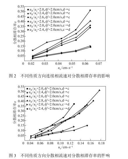 圖5是篩板在不同振動速率下的分散相滯存率變化情況。圖中結果顯示:分散相滯存率隨著篩板振動速率Af的增加而增大。振動的篩板對液滴有強烈的剪切作用,加速了液滴破碎、聚并和再破碎過程,固分散相滯存率隨Af增大。