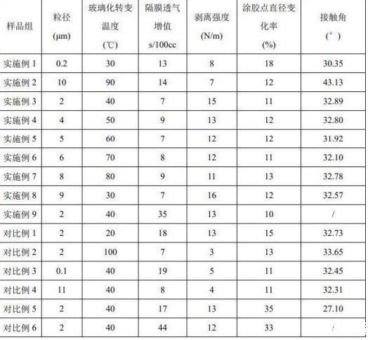 測試結(jié)果表明,當(dāng)膠液稀釋液表面張力在28mN/m以上時,隔膜粘接劑組合物涂布并干燥后的膠點直徑變化率較小,當(dāng)表面張力太低時,膠點直徑變化率較大,透氣增值變大。當(dāng)聚合物顆粒A粒徑在0.2-10μm,玻璃化轉(zhuǎn)變溫度在30-90℃范圍內(nèi)時,隔膜同時具有較低的透氣增值以及更好的剝離強(qiáng)度。聚合物顆粒A粒徑太小時,容易堵塞隔膜孔道造成透氣增值增大,并且剝離強(qiáng)度也較弱。聚合物顆粒A粒徑太大,聚合物顆粒A涂布后容易脫落,剝離強(qiáng)度降低。聚合物顆粒A玻璃化溫度太高,熱壓時無法軟化,剝離強(qiáng)度低;而玻璃化溫度太低則容易成膜,造成隔膜透氣增值變大。