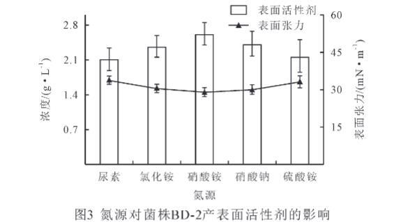 氮源在微生物生長和酶的合成中起著重要作用。由圖3可得,氮源種類對菌株BD-2產表面活性劑的影響存在顯著差異,以硝酸銨、硝酸鈉和氯化銨為氮源時,菌株BD-2產表面活性劑的量顯著高于尿素和硫酸銨(P<0.05),其產表面活性劑量大小依次為硝酸銨>硝酸鈉>氯化銨>硫酸銨>尿素;以硝酸銨、硝酸鈉和氯化銨為氮源時,菌株BD-2能顯著降低發(fā)酵液表面張力(P<0.05),表面張力大小依次為尿素>硫酸銨>氯化銨>硝酸鈉>硝酸銨。以硝酸銨為氮源時,表面活性劑量最高,為2.40 g/L,而表面張力最低,為29 mN/m。研究結果表明,硝酸銨有利于菌株BD-2產表面活性劑,而硝酸鈉和氯化銨效果不明顯,因此,選擇硝酸銨為菌株BD-2的最適氮源。