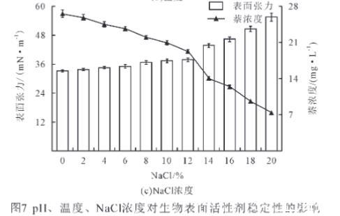 如圖7(c)所示,隨著NaCl濃度增加,萘濃度顯著下降(P<0.05),但NaCl濃度在8%以內,萘濃度均高于21 mg/L,表明生物表面活性劑對萘的增溶穩(wěn)定;而液體表面張力總體呈現(xiàn)上升的趨勢,其中,NaCl濃度12%以內,液體表面張力變化不顯著(P>0.05),說明菌株BD-2產的生物表面活性劑能夠在一定鹽度范圍內,較好地降低液面張力。