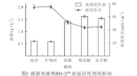 碳源對微生物的生長和次生代謝產物的產生有重要的影響。由圖2可知,不同碳源對菌株BD-2產表面活性劑量的影響不同,本實驗將原油、礦物油作為一類復雜碳源,葡萄糖、麥芽糖、蔗糖作為簡單碳源,進行對比分析發(fā)現(xiàn),以簡單碳源作為底物時,菌株BD-2產表面活性劑的量顯著高于復雜碳源(P<0.05),其產表面活性劑量大小依次為葡萄糖>麥芽糖>蔗糖>原油>礦物油。同時以簡單碳源為底物時,菌株BD-2能顯著降低發(fā)酵液表面張力(P<0.05),其發(fā)酵液表面張力大小依次為原油>礦物油>蔗糖>麥芽糖>葡萄糖。在簡單碳源中,以葡萄糖為碳源時,菌株BD-2產生的表面活性劑的量最高,為2.26 g/L,而表面張力最低,為32.7 mN/m。研究結果表明,簡單碳源有利于菌株BD-2產表面活性劑。因此,選擇葡萄糖為菌株BD-2的碳源。
