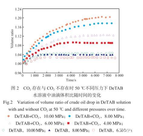 圖2為50℃下,CO2存在與CO2不存在時,DeTAB水溶液/原油體系中,油滴的體積與初始體積比隨時間的變化。由圖2可知,對于原油/CO2/DeTAB水溶液體系,在初始階段,油滴體積增加較快,在油滴體積增加到平衡值附近后,體積增加變緩慢。油滴體積達到穩(wěn)定所需時間在3 500~6 500 s范圍內(nèi)。同時,隨著壓力的升高,油滴的平衡體積與初始體積比逐漸增大,這與原油體積膨脹系數(shù)隨著CO2壓力增大而增大相吻合。不含CO2的DeTAB水溶液/原油體系中,油滴體積達到平衡值所需時間在1 300 s左右,遠小于CO2存在時達到平衡狀態(tài)所需的時間;同時,油滴體積的增加幅度明顯低于CO2存在時的情況。CO2存在時,DeTAB水溶液/原油體系中,油滴體積的明顯增大,說明水中溶解的CO2可以有效地擴散進入油相中,實現(xiàn)其對原油的溶脹效果,這將利于將油藏孔隙中的一部分殘余油排出,從而提高油田采收率。