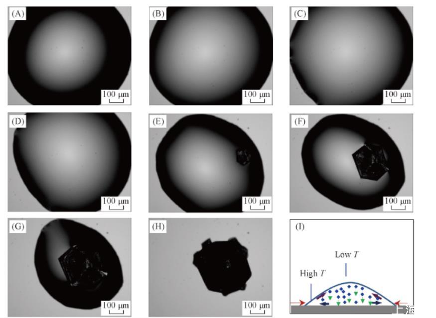 實(shí)驗(yàn)發(fā)現(xiàn),純水液滴和NaCl水溶液液滴在玻璃基底上蒸發(fā)時(shí)其三相接觸線均發(fā)生不同程度的收縮。圖1所示為NaCl溶液液滴的蒸發(fā)過程。可以看出,接觸線的收縮并非連續(xù)不斷,而是在一定時(shí)間內(nèi)先保持“釘扎”[圖1(A),(B)].在此過程中,接觸角不斷減小,從而使得表面張力的水平分力增大,當(dāng)其超越基底對接觸線產(chǎn)生釘扎作用時(shí),就會(huì)引起接觸線的收縮。由于基底結(jié)構(gòu)的不均勻性,液滴各方向的收縮也可能是不均勻的,如圖1(C)——(H)所示。由于蒸發(fā)過程中接觸線不能釘扎,蒸發(fā)造成的Marangoni對流以及重力沉降作用使得NaCl在液滴中心區(qū)域富集,如圖1(I)所示。因而NaCl晶體首先在液滴中心區(qū)域析出。